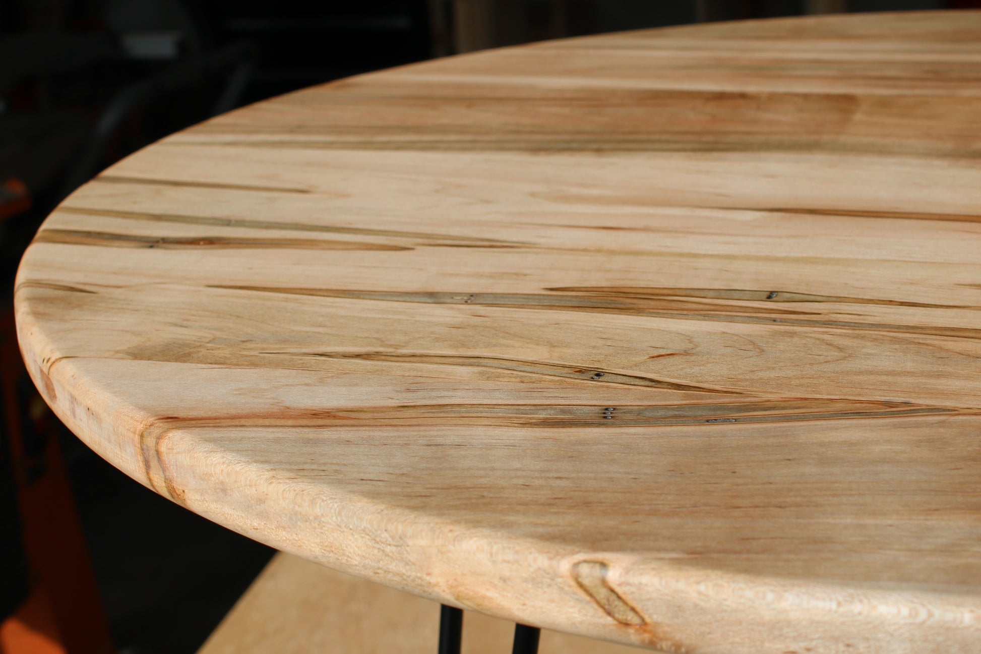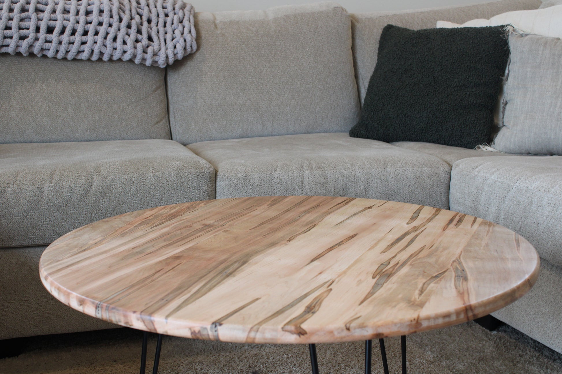 A blend of simplicity and natural beauty, this round coffee table is crafted from Ambrosia Maple, known for its unique grain patterns and soft, flowing tones. The solid maple top features subtle streaks and character marks that make each piece naturally one of a kind.