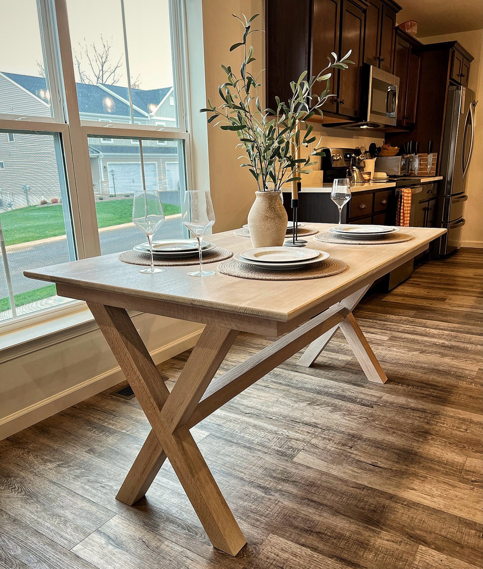 The Gomez Dining Table brings modern farmhouse style to life with clean lines and timeless character. Crafted from durable red oak, it’s finished in a lighter tone that mimics the look of white oak, giving it a soft, natural warmth. A subtle beveled edge adds just enough detail, making it a versatile centerpiece for both rustic and contemporary spaces.